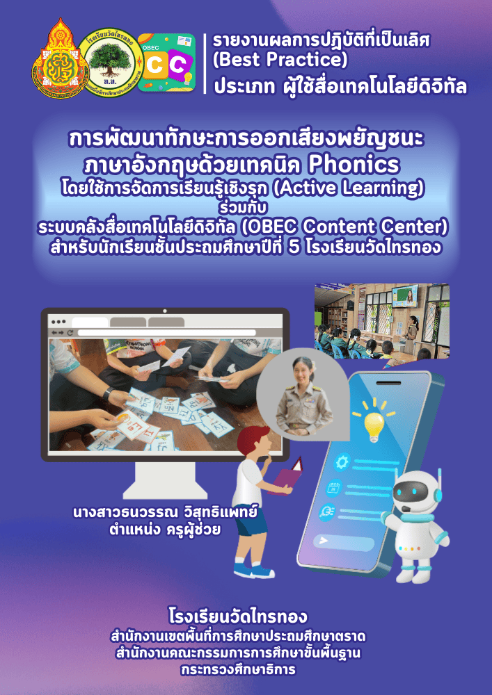 Best Practice การพัฒนาทักษะการออกเสียงพยัญชนะภาษาอังกฤษด้วยเทคนิค Phonics โดยใช้การจัดการเรียนรู้เชิงรุก (Active Learning) ร่วมกับระบบคลังสื่อเทคโนโลยีดิจิทัล (OBEC Content Center) สำหรับนักเรียนชั้นประถมศึกษาปีที่ 5 โรงเรียนวัดไทรทอง |